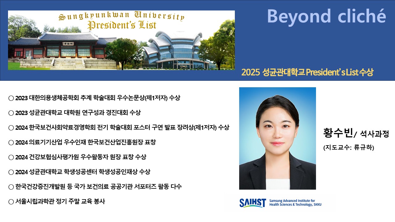 SAIHST 의료기기산업학과 석사과정 황수빈 학생이 성균관대학교 ‘2025 President’s List’ 수상자로 선정되었습니다. President’s List는 우리 대학의 건학이념인 수기치인(修己治人)의 모습을 보여주는 학생성공모델사례 발굴을 위해 2019년부터 시행 중인 제도로, 매년 전체 학부생 및 대학원생을 대상으로 우수학생을 선발하여 시상하고 있습니다.